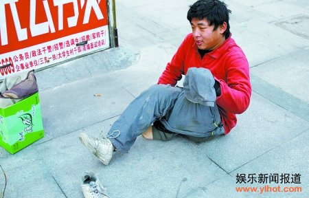 他掏出打火机点了几次才把烟点着。然后,记者要求他表演把腿藏进裤管内扮成残疾人乞讨。他见记者并无恶意,笑了笑便把左脚上的破球鞋脱掉,坐地上眨眼间脱掉左腿上的外裤,双手扳住左脚把小腿与大腿折叠起来,把左脚垫在屁股下面对记者说:“就是这样。”